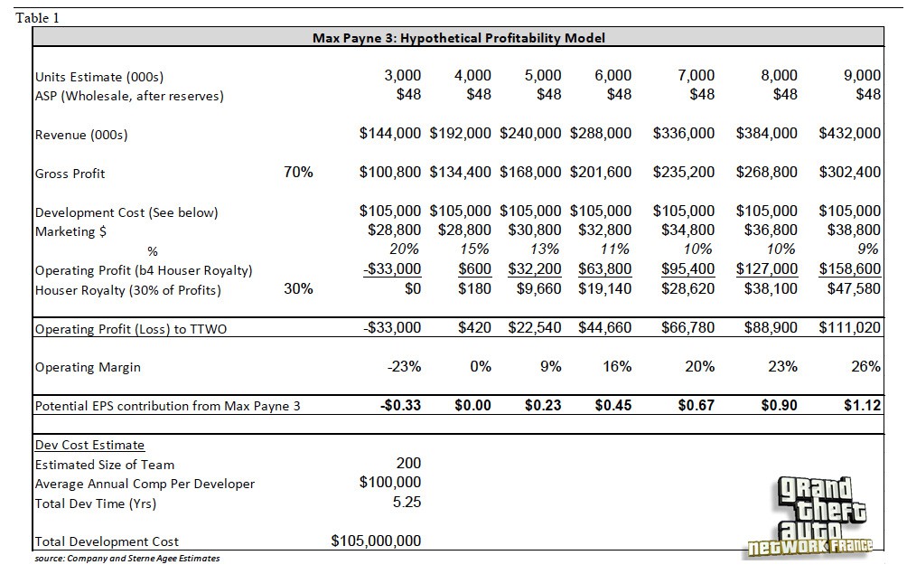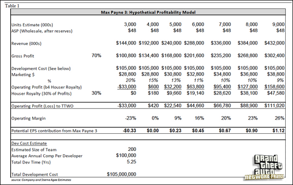 Le tableau suivant nous montre un estimé des coûts de production et des profits engendrés par Max Payne 3 (sortie prévue pour mai 2012) :
